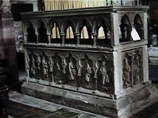 This tomb at Abergavenny Priory Church is said to be that of Eva de Braose and her beloved pet squirrel. Local legend tells how the squirrel scampered over the castle wall and in her efforts to recover it, Eva toppled to her death. The stone squirrel has not survived. It was attached to a chain leading to a reinforced pocket in Eva's gown, which is the only evidence still visible.